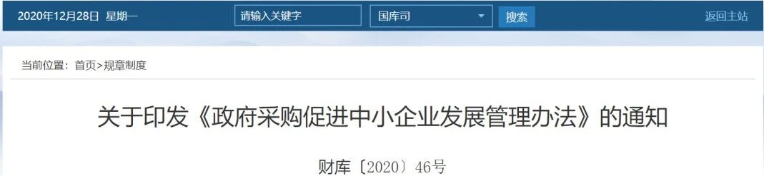 关于印发《政府采购促进中小企业发展管理办法》的通知财库〔2020〕46号 各中央预算单位办公厅(室),各省、自治区、直辖市、计划单列市财政厅(局)、工业和信息化主管部门,新疆生产建设兵团财政局、工业和信息化主管部门: 为贯彻落实《关于促进中小企业健康发展的指导意见》,发挥政府采购政策功能,促进中小企业发展,根据《中华人民共和国政府采购法》、《中华人民共和国中小企业促进法》等法律法规,财政部、工业和信息化部制定了《政府采购促进中小企业发展管理办法》。现印发给你们,请遵照执行。 附件:政府采购促进中小企业发展管理办法 财 政 部 工业和信息化部 2020年12月18日 政府采购促进中小企业发展管理办法 第一条 为了发挥政府采购的政策功能,促进中小企业健康发展,根据《中华人民共和国政府采购法》、《中华人民共和国中小企业促进法》等有关法律法规,制定本办法。 第二条 本办法所称中小企业,是指在中华人民共和国境内依法设立,依据国务院批准的中小企业划分标准确定的中型企业、小型企业和微型企业,但与大企业的负责人为同一人,或者与大企业存在直接控股、管理关系的除外。 符合中小企业划分标准的个体工商户,在政府采购活动中视同中小企业。 第三条 采购人在政府采购活动中应当通过加强采购需求管理,落实预留采购份额、价格评审优惠、优先采购等措施,提高中小企业在政府采购中的份额,支持中小企业发展。 第四条 在政府采购活动中,供应商提供的货物、工程或者服务符合下列情形的,享受本办法规定的中小企业扶持政策: (一)在货物采购项目中,货物由中小企业制造,即货物由中小企业生产且使用该中小企业商号或者注册商标; (二)在工程采购项目中,工程由中小企业承建,即工程施工单位为中小企业; (三)在服务采购项目中,服务由中小企业承接,即提供服务的人员为中小企业依照《中华人民共和国劳动合同法》订立劳动合同的从业人员。 在货物采购项目中,供应商提供的货物既有中小企业制造货物,也有大型企业制造货物的,不享受本办法规定的中小企业扶持政策。 以联合体形式参加政府采购活动,联合体各方均为中小企业的,联合体视同中小企业。其中,联合体各方均为小微企业的,联合体视同小微企业。 第五条 采购人在政府采购活动中应当合理确定采购项目的采购需求,不得以企业注册资本、资产总额、营业收入、从业人员、利润、纳税额等规模条件和财务指标作为供应商的资格要求或者评审因素,不得在企业股权结构、经营年限等方面对中小企业实行差别待遇或者歧视待遇。 第六条 主管预算单位应当组织评估本部门及所属单位政府采购项目,统筹制定面向中小企业预留采购份额的具体方案,对适宜由中小企业提供的采购项目和采购包,预留采购份额专门面向中小企业采购,并在政府采购预算中单独列示。 符合下列情形之一的,可不专门面向中小企业预留采购份额: (一)法律法规和国家有关政策明确规定优先或者应当面向事业单位、社会组织等非企业主体采购的; (二)因确需使用不可替代的专利、专有技术,基础设施限制,或者提供特定公共服务等原因,只能从中小企业之外的供应商处采购的; (三)按照本办法规定预留采购份额无法确保充分供应、充分竞争,或者存在可能影响政府采购目标实现的情形; (四)框架协议采购项目; (五)省级以上人民政府财政部门规定的其他情形。 除上述情形外,其他均为适宜由中小企业提供的情形。 第七条 采购限额标准以上,200万元以下的货物和服务采购项目、400万元以下的工程采购项目,适宜由中小企业提供的,采购人应当专门面向中小企业采购。 第八条 超过200万元的货物和服务采购项目、超过400万元的工程采购项目中适宜由中小企业提供的,预留该部分采购项目预算总额的30%以上专门面向中小企业采购,其中预留给小微企业的比例不低于60%。预留份额通过下列措施进行: (一)将采购项目整体或者设置采购包专门面向中小企业采购; (二)要求供应商以联合体形式参加采购活动,且联合体中中小企业承担的部分达到一定比例; (三)要求获得采购合同的供应商将采购项目中的一定比例分包给一家或者多家中小企业。 组成联合体或者接受分包合同的中小企业与联合体内其他企业、分包企业之间不得存在直接控股、管理关系。 第九条 对于经主管预算单位统筹后未预留份额专门面向中小企业采购的采购项目,以及预留份额项目中的非预留部分采购包,采购人、采购代理机构应当对符合本办法规定的小微企业报价给予6%—10%(工程项目为3%—5%)的扣除,用扣除后的价格参加评审。适用招标投标法的政府采购工程建设项目,采用综合评估法但未采用低价优先法计算价格分的,评标时应当在采用原报价进行评分的基础上增加其价格得分的3%—5%作为其价格分。 接受大中型企业与小微企业组成联合体或者允许大中型企业向一家或者多家小微企业分包的采购项目,对于联合协议或者分包意向协议约定小微企业的合同份额占到合同总金额30%以上的,采购人、采购代理机构应当对联合体或者大中型企业的报价给予2%-3%(工程项目为1%—2%)的扣除,用扣除后的价格参加评审。适用招标投标法的政府采购工程建设项目,采用综合评估法但未采用低价优先法计算价格分的,评标时应
