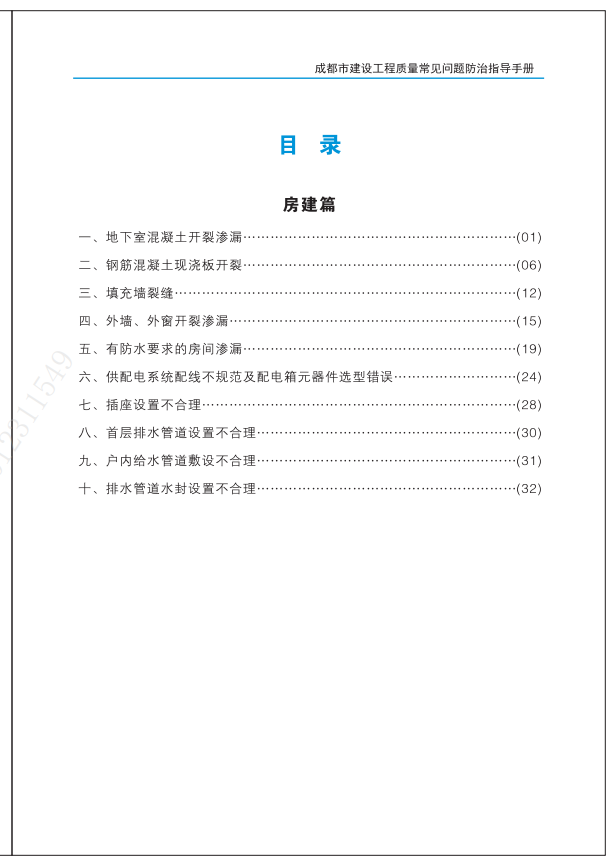 天府新区成都管委会自然资源和规划建设局、成都东部新区公共服务局、成都高新区公园城市建设局,各区(市)县住建行政主管部门,市质监站,各相关企业: 为推动建筑业高质量发展理念,认真贯彻“以人为本、质量第一、源头治理、效益优先”的新发展理念,提高人民群众的获得感幸福感安全感,进一步构建我市质量管理的长效机制,提升全市建设工程质量品质,我局在质量常见问题五年治理成果基础上,参照国家、省、市技术标准,充分调研、咨询、讨论,编制了《成都市建设工程质量常见问题防治指导手册》,现印发你们,请认真贯彻执行。 附件:成都市建设工程质量常见问题防治指导手册 成都市住房和城乡建设局 2020年10月29日 扫码查看全文(可下载)↓