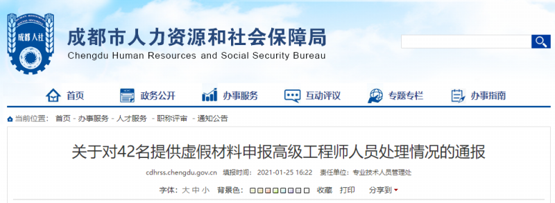 1月25日,成都一次性通报42人,存在提供虚假申报材料在成都市申报高级工程师职称的情况。