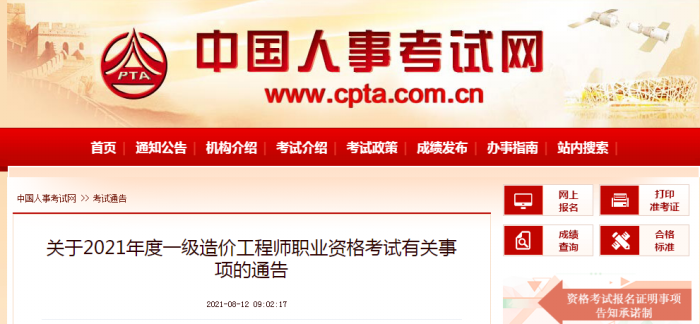 根据《人力资源社会保障部办公厅关于2021年度专业技术人员职业资格考试工作计划及有关事项的通知》(人社厅发〔2021〕4号)有关安排,2021年度一级造价工程师职业资格考试于10月30日、31日举行,考试形式为纸笔考试。考试报名即将开始,现将有关事项通告如下: