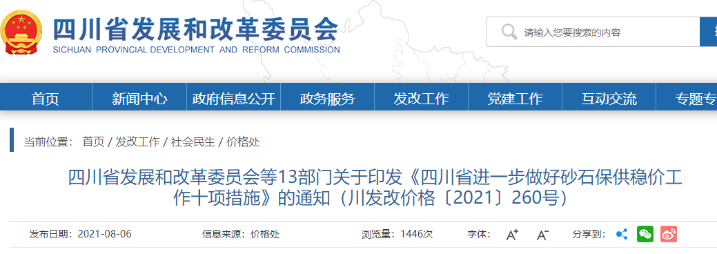省发改委等13部门印发《四川省进一步做好砂石保供稳价工作十项措施》来源:四川省发改委